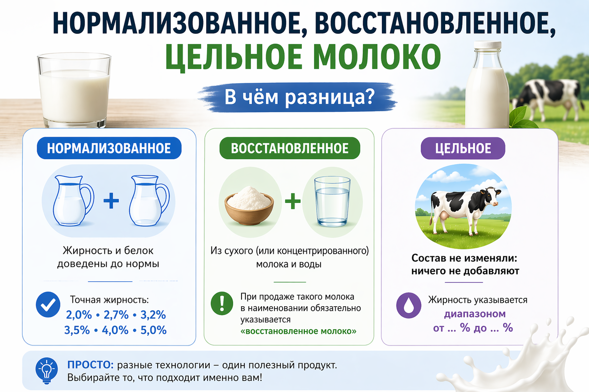 И у многих покупателей такие слова вызывают вопросы. Что это значит? Какое молоко натуральное? Есть ли между ними принципиальная разница? На самом деле эти термины не должны настораживать. Это не «сложная химия» и не попытка что-то скрыть, а понятные технологические определения, которые помогают разобраться, какой именно продукт перед вами. Разберёмся простыми словами. Нормализованное молоко — это молоко, в котором массовую долю жира и белка доводят до нормы, установленной стандартом. Звучит сложно, но смысл очень простой: производитель делает так, чтобы жирность молока была стабильной и соответствовала тому, что указано на упаковке. Например, если вы видите молоко с жирностью 2,0 %, 2,7 %, 3,2 %, 3,5 %, 4,0 % или 5,0 %, это и есть нормализованное молоко. Для этого в молоко могут добавить сливки, если нужно повысить жирность, или обезжиренное молоко, если нужно её уменьшить. То есть нормал