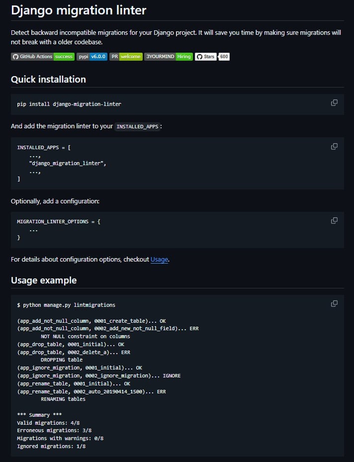 π» Django migration linter β ΡΡΠΎ ΠΈΠ½ΡΡΡΡΠΌΠ΅Π½Ρ Π΄Π»Ρ Π°Π½Π°Π»ΠΈΠ·Π° ΠΌΠΈΠ³ΡΠ°ΡΠΈΠΉ Π² Django-ΠΏΡΠΎΠ΅ΠΊΡΠ°Ρ , ΠΊΠΎΡΠΎΡΡΠΉ ΠΎΠ±Π½Π°ΡΡΠΆΠΈΠ²Π°Π΅Ρ ΠΎΠ±ΡΠ°ΡΠΈΠΌΠΎ Π½Π΅ΡΠΎΠ²ΠΌΠ΅ΡΡΠΈΠΌΡΠ΅ ΠΈΠ·ΠΌΠ΅Π½Π΅Π½ΠΈΡ