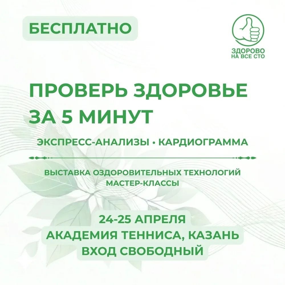 » ✅ Экспресс-анализы и кардиограмма — бесплатно, 15 минут; ✅ Выставка товаров для здоровья и активного долголетия; ✅ Мастер-классы по йоге, цигун и дыхательным практикам. Академия тенниса, Оренбургский тракт, 101 24-25 апреля, вход свободный, по регистрации! Зарегистрируйтесь сейчас: https://здоровонавсесто.рф/kazan-2026/ Приходите сами, зовите друзей и родителей! Будет полезно, интересно и душевно.