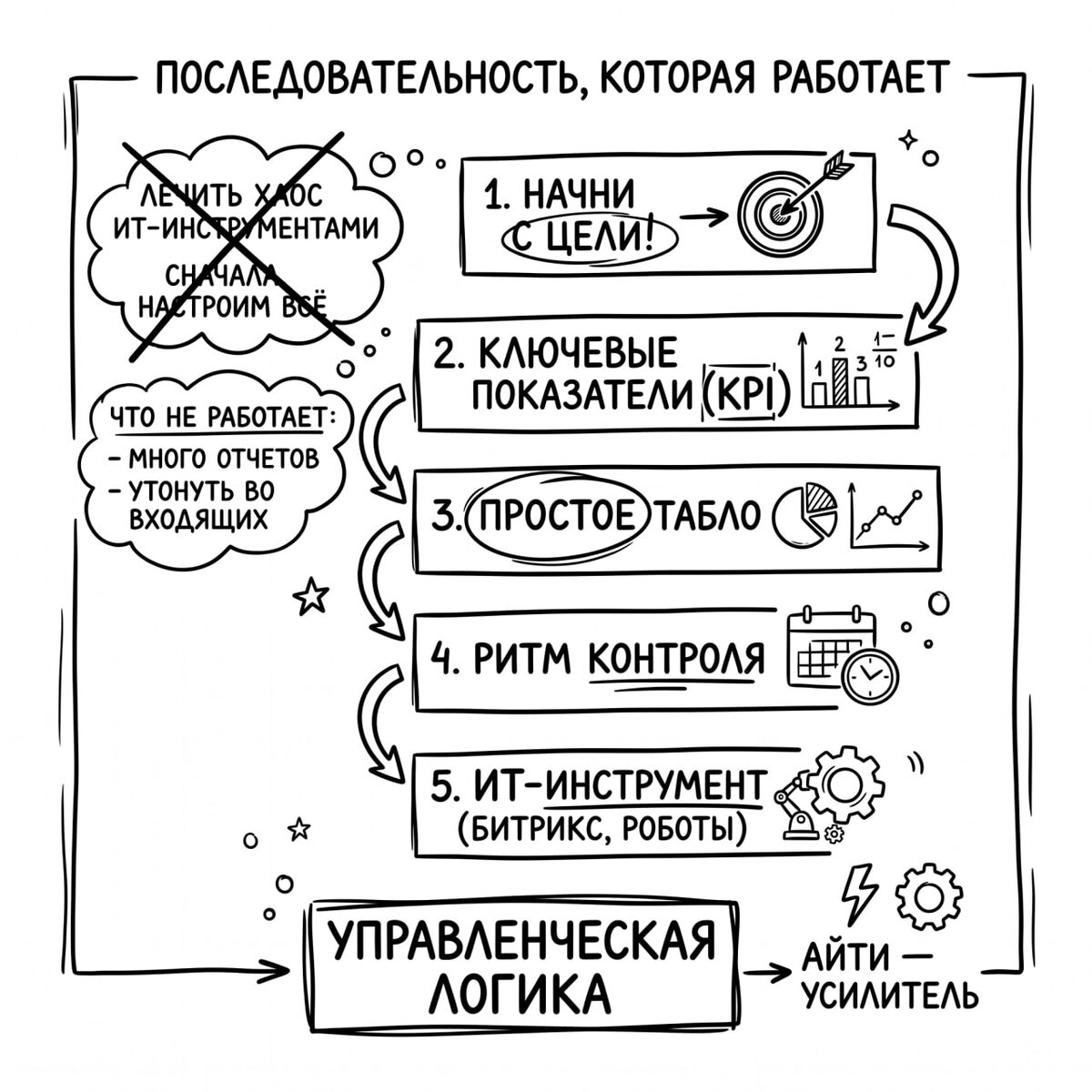 #ОтХаосаКУправлению #управление #автоматизация #хаос Часть №6. Подвожу итоги ... После всех этих кругов я наконец собрал для себя последовательность, которая у меня сейчас работает лучше всего. Не идеальную. Не волшебную. Но работающую сильно лучше, чем мои старые заходы через «сейчас все настроим». 1. Я начинаю не с системы. Я начинаю с цели. Не с общей фразы. Не с «надо улучшить работу отдела». А с понятной цели в цифре и во времени. 2. Потом смотрю на несколько ключевых показателей. Не на двадцать. Не на полсотни. А на те, по которым реально видно, движемся мы к цели или нет. 3. Потом собираю простое табло. Такое, чтобы руководитель утром за пару минут увидел картину: - Где он по плану. - Где просадка. - У кого отклонение. - Куда сегодня надо идти руками. 4. Потом настраиваю ритм: Что он смотрит каждый день. Что обсуждает каждую неделю. Когда вмешивается. Когда не вмешивается. Когда идет в детали. Когда держит уровень показателей. 5. И только после этого я думаю про инструме