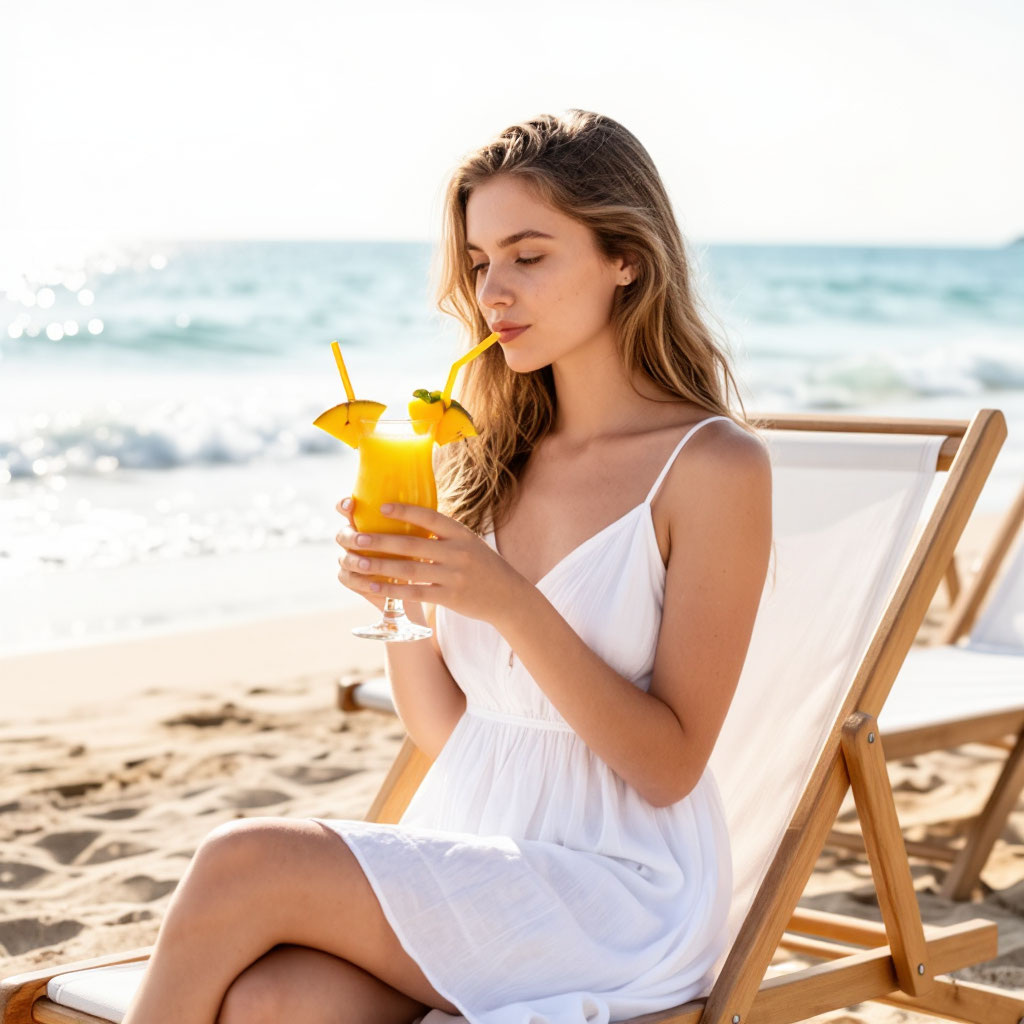 После разговора с подругой я ещё несколько минут просто лежу на шезлонге и дышу морским воздухом. Потом вспоминаю про свой коктейль. Он уже стал немного нагреваться от солнца, поэтому я спешу его попробовать. На вкус неплохой. Чувствуется манго, но очень много сахара добавлено в напиток. Да уж, прощай диета!
