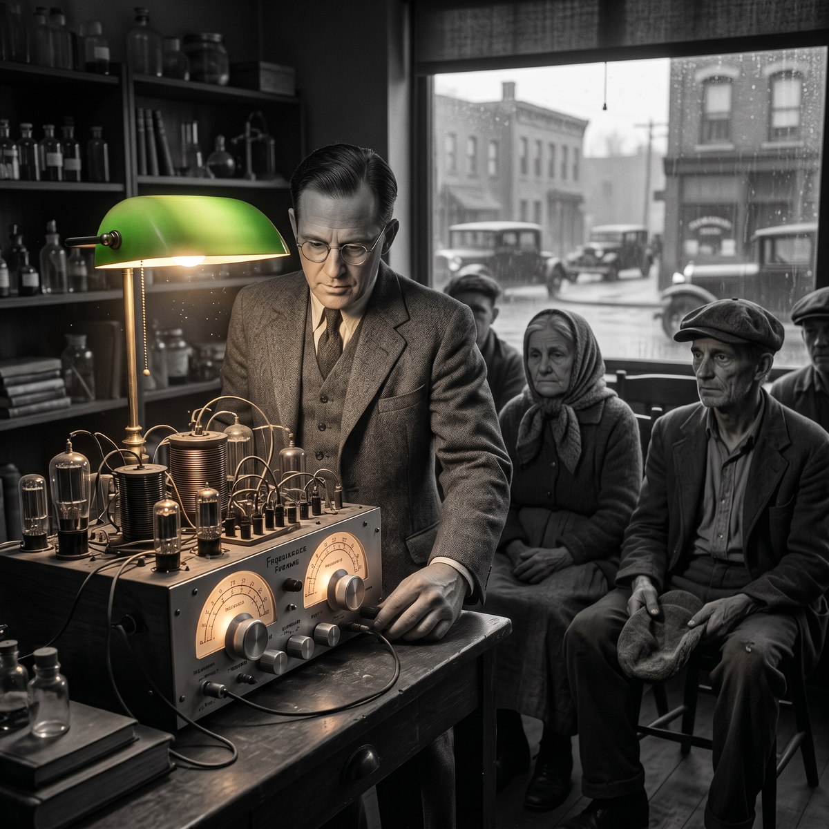 Кабинет доктора Роял Райфа утопал в полумраке. На столе горела зелёная лампа, освещая серебристые бокалы его самодельного аппарата. За окном бушевал 1934 год — год Великой Депрессии, пыльных бурь и угасающих надежд. Но в этой комнате надежда обретала форму звука.