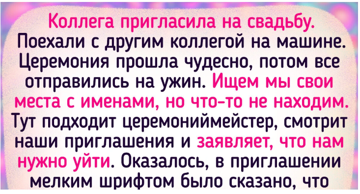 Как-то коллега пригласила меня на свадьбу — а это 8 часов езды в одну сторону. Мы с другим коллегой решили поехать на машине и забронировали гостиницу на ночь. Приезжаем, готовимся, хозяйка апартаментов любезно отвезла нас в церковь в горах, где и прошла прекрасная свадебная церемония. В общем, фотографируем невесту, общаемся с гостями и собираемся ехать на ужин вместе с остальными. Добираемся до места проведения, пытаемся найти наши места, но что-то никак не можем увидеть свои имена на табличках. Приходит церемониймейстер, смотрит на наши приглашения, а потом заявляет, что нас приглашали только в церковь, а сейчас нам придется уйти. В приглашении мелким шрифтом было написано, что на ужин нас не звали. © Baby8227