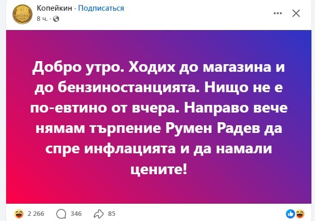 "Доброе утро! был в магазине и на заправке. Ничего не подешевело со вчерашнего дня. Прямо не могу дождаться, когда Румен Радев остановит инфляцию и уменьшит цены!"