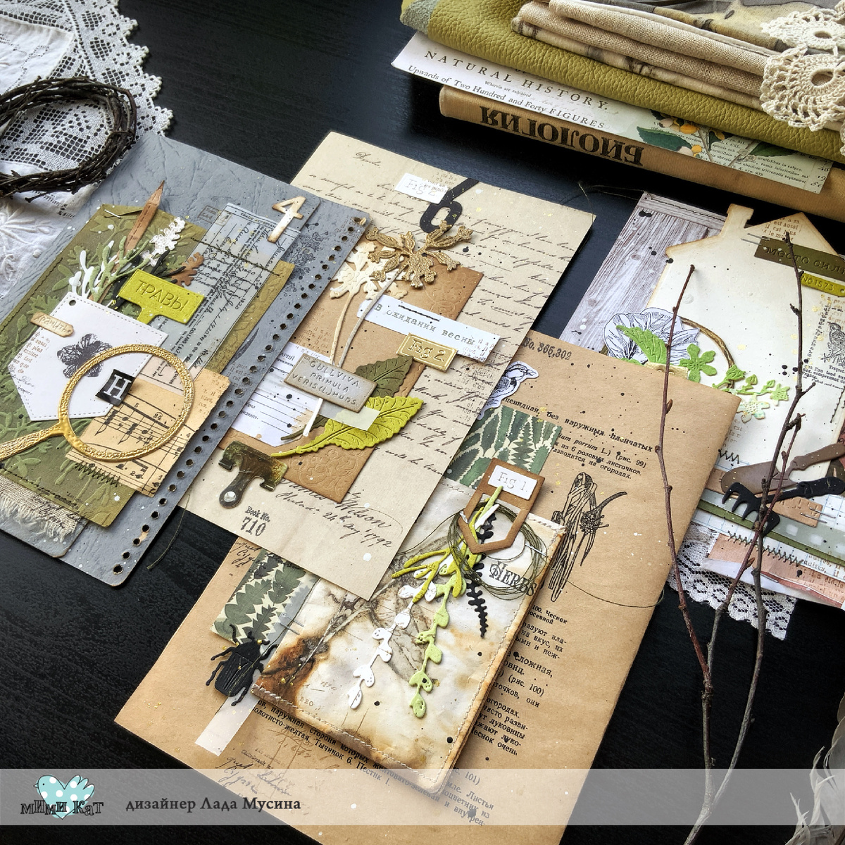 Привет-привет! С вами снова Лада Мусина. С удовольствием и весенним настроением возвращаюсь к ботанике. Перебрала гербарий, выудила из запасов картон в оттенках молодой зелени, сделала вырубку, декорировала ее эмбоссингом, добавила немного красивых скраппринтов - руки захотели сделать что-то красивое. А сколько подходящего бумажного «мусора» было уже собрано и ожидало своего часа. Даа, опять делаю джанк! Пока собрала несколько страничек, но они сильно вдохновляют на работу над ботаническим блокнотом с налетом винтажа. А Мимикат читает мои мысли и каждую весну выдает оригинальные ножи, которые мотивируют сочинять новые истории с ботаникой в главной роли. В этом релизе это ножи «Примула», «Садовые таблички», «Учат в школе», «Искренне Ваш», «Конь, мой конь». Подхватывают ботаническую тему ножи из стареньких - «Следопыт», «Лето в кармане», «Что посеешь, то и пожнешь», «Во саду ли, в огороде», «Светлой Пасхи», «Что скрывает шкаф», папка «Ботаника».