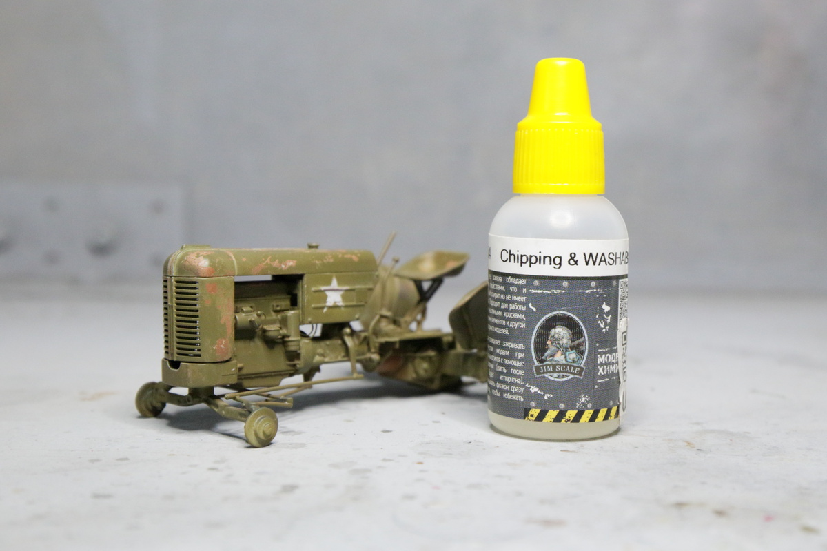 Сегодня поговорим о технике имитации сколов и потертости краски на моделях - о чиппинге. В соответствии с легендой, придуманной мной для плана окраски и визиринга модели трактора Case Vai, он изначально служил в армии США, затем был списан и продан работяге - фермеру. Для визиринга это означает, что я буду делать перекрашенный старый армейский трактор. Чтобы он выглядел правдоподобно, я сперва сделаю старый армейский трактор. Для этого я буду имитировать сколы и потертости краски - чиппинг. Поскольку трактор старый, из-под облупившейся армейской окраски должна проступать ржавчина. Поэтому я сперва задул модель ржаво-коричневым цветом и покрыл глянцевым лаком, чтобы повысить устойчивость "ржавчины" к процедуре чиппинга. Чтобы старость трактора выглядела правдоподобно, звезды на бортах капота я тоже сделаю облупившимися. Для выполнения процедуры чиппинга буду использовать специальную жидкость от Jim Scale. На фото - то, что у меня в итоге получится. Но это будет потом. А сейчас - начина