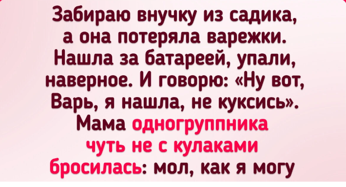 - Внучку у меня зовут Варвара. Забираю из садика, а она потеряла варежки. Нашла за батареей, упали, наверное. И говорю: «Ну вот, Варь, я нашла, не куксись». Мама одногруппника чуть не с кулаками бросилась: мол, как я могу ребенка тварью называть. Мы пришли в первый раз, и она не знала, как зовут ребенка, а я сначала и не поняла, чего она на меня взъелась. © Marinyschka