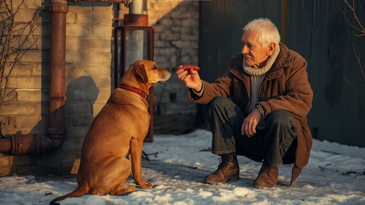 Так прошло несколько дней. Каждый раз Василий Семёнович приносил что мог: хлеб, картошку, однажды кусочек рыбы. Пёс ел и смотрел. На пятый день он не убрал морду, когда Василий Семёнович потянулся рукой поближе. На шестой он позволил коснуться уха. На седьмой встал, когда старик подошёл, и стоял, пока тот его гладил по слипшейся шерсти.