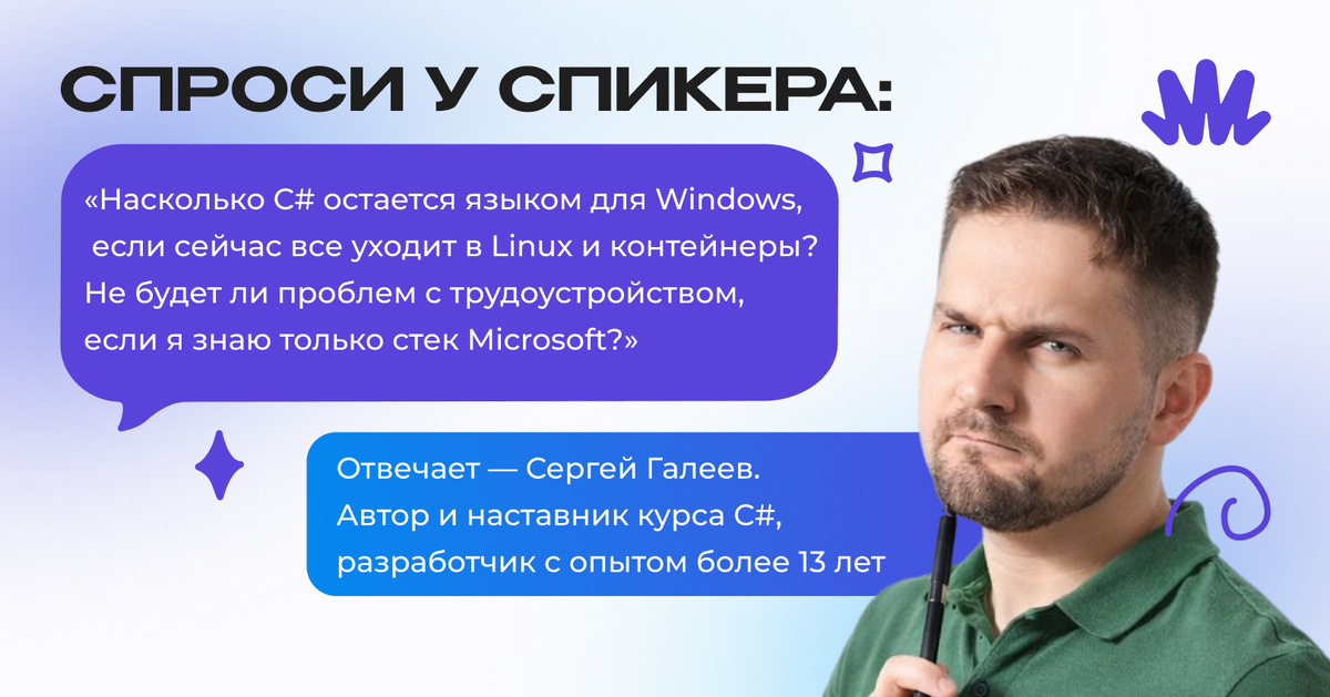 Продолжаем знакомить вас с авторами и наставниками на наших курсах 👋 Сегодня Сергей Галеев отвечает на важный вопрос: Насколько C# остается языком для Windows, если сейчас все уходит в Linux и контейнеры? Не будет ли проблем с трудоустройством, если я знаю только стек Microsoft? До сих пор встречается мнение, что C# и весь Microsoft-стек - только про Windows. Хотя Java, например, тоже долго ассоциировалась с Oracle, а Go - с Google. Сам факт, что язык или платформа связаны с большой компанией, сам по себе мало о чем говорит. Если 10–15 лет назад C# и правда был сильно завязан на Windows, то сейчас картина давно изменилась. Раньше все крутилось вокруг .NET Framework, IIS, Windows Server и MSSQL. Почти весь стек жил внутри экосистемы Microsoft, поэтому такая ассоциация была вполне понятной. Сейчас C#-backend чаще выглядит совсем иначе: ASP.NET Core, Docker, Linux-контейнеры, PostgreSQL, Redis, очереди, CI/CD, облака и прочая привычная инфраструктура, которая есть почти в любой backen