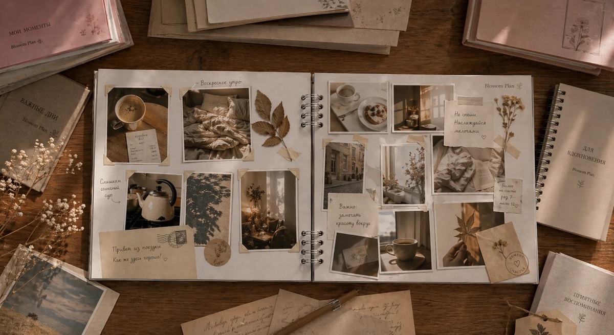 Елена на связи. Редактор Blossom Plan и по совместительству человек, который уже третий год наблюдает, как люди покупают красивые альбомы — и благополучно забывают про них через неделю. Знаете, в чем парадокс? Мы покупаем альбомы, чтобы сохранить воспоминания, а в итоге получаем еще один предмет для чувства вины. «Надо бы заполнить», «где те фото с отпуска», «опять не успела»... Стоп. Давайте без этого. Проблема не в вас. Проблема в том, что нам вручили инструмент без инструкции. Представьте: вы купили роскошный набор для вышивания, а там — нитки, ткань, иголки, но ни слова о том, как делать первые стежки. Примерно так же мы подходим к фотоальбомам. Типичные сценарии провала: - Ждем «особенных» фото (а жизнь между тем состоит из обычных дней) - Пугаемся объема (200 фото — это не про вас, пока) - Пытаемся сделать идеально (и откладываем на «когда будет время») Между тем, квадратный альбом 21×21 см — это не архив, а пространство для экспериментов. Сюда можно вклеить: - Чек из любимой коф
