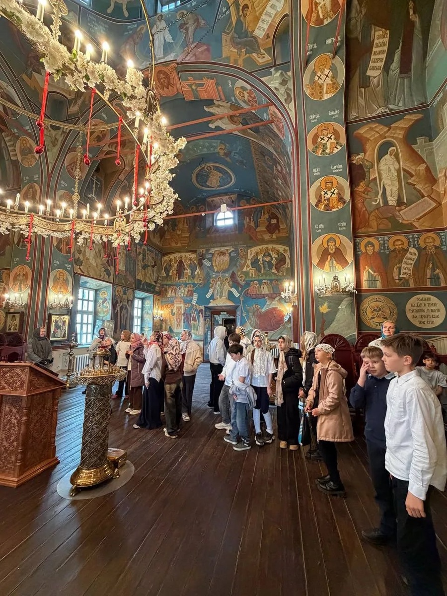 Ребята пришли на экскурсию по храму, во время которой настоятель храма иерей Евгений Диммерт рассказал о трёх престолах, об истории храма и усадьбы, а также о том, зачем люди приходят на службы.