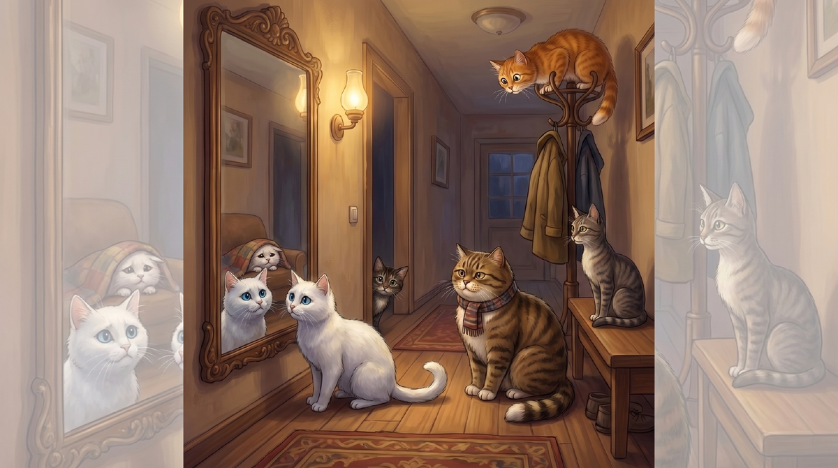 Зеркала. Кто-то может сказать, что он был глупеньким маленьким котёнком, но это совсем не так. Он был вовсе не глупый, он был осторожный. А осторожные коты, как это конечно же всем известно, иногда пугаются не того, что страшно, а того, что непонятно. Однажды Хозяйка купила большое зеркало и повесила его в коридор. Она решила, что так ей будет удобнее примерять одежду. Мурландия решила, что это дверь в параллельный мир. Кнопка увидела отражение первой и сделала классическое кошачье движение: «Я сейчас кааааак нападу!”