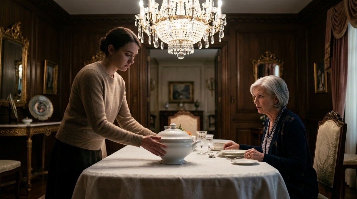 Глубокие тарелки с золотой каёмочкой стояли на своих местах, отражая свет хрустальной люстры. Рядом с каждой тарелкой ровным строем лежали начищенные до блеска мельхиоровые ложки и тяжёлые ножи. Аня аккуратно поставила супницу в центр, стараясь не выдать дрожь в руках.