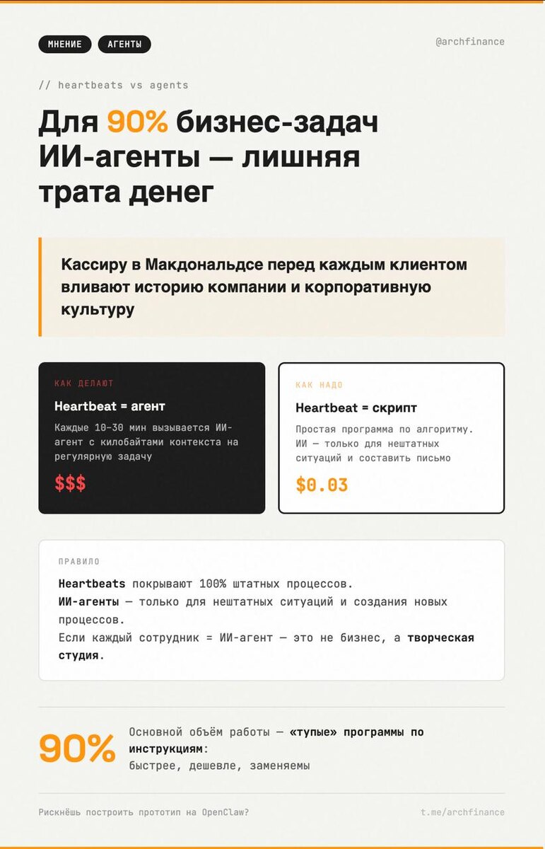 Построй прототип бизнеса на ИИ-агентах (писал про OpenClaw) — и быстро поймёшь, где деньги утекают. Проблема называется heartbeats: регулярные задачи, которые запускаются каждые 10–30 минут. Проверить статус. Обновить таблицу. Отправить напоминание. И каждый раз вызывается полноценный ИИ-агент с килобайтами контекста. Это как кассиру в Макдональдсе перед каждым клиентом вливать историю компании и корпоративную культуру. Heartbeats — это 100% штатных процессов. Они должны выполняться простыми программами с чётким алгоритмом. Если и нужен ИИ — то элементарный: составить письмо, подобрать формулировку. Не агент с SOUL.md и памятью. Агенты — для нештатных ситуаций. Для создания новых процессов. Для того, что нельзя описать алгоритмом заранее. Всё остальное — «тупые» сотрудники по инструкциям: быстрее, дешевле, заменяемы. Если каждый процесс в бизнесе = ИИ-агент — это не бизнес. Это творческая студия с бесконечным бюджетом. Рискнёшь проверить на практике? Подними прототип на OpenClaw и