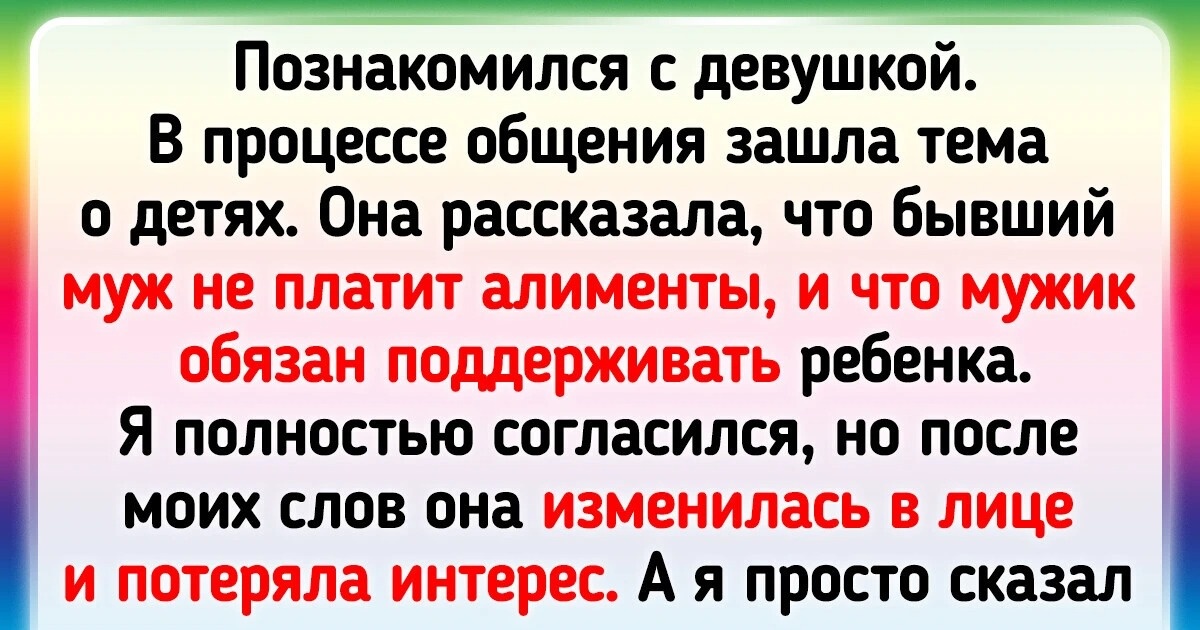 Познакомился с девушкой. Встретились в кафе, в процессе общения зашла тема о детях. Она рассказала, что бывший муж не платит алименты, и что мужик обязан поддерживать ребенка. Я полностью согласился, но после моих слов она изменилась в лице и потеряла всякий интерес. А я просто сказал, что тоже не понимаю мужиков, которые скрываются от алиментов, и сам исправно плачу пару десятков в месяц. Задал потом пару вопросов, в ответ на которые в ее глазах появился синий экран, и ушел. © Kat777g / Pikabu