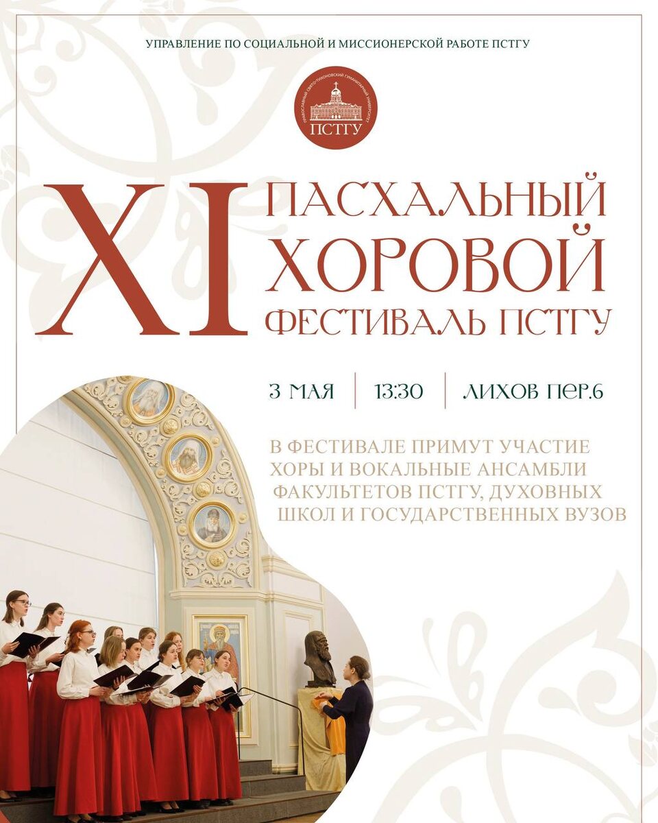 ! 3 мая по благословению ректора Преосвященного Мефодия, епископа Егорьевского, состоится XI Пасхальный хоровой фестиваль Православного Свято-Тихоновского гуманитарного университета. Около 500 участников соберутся, чтобы подарить зрителям незабываемые моменты и напомнить, как прекрасна традиция хорового пения. В этом году в фестивале примут участие хоры и вокальные ансамбли факультетов ПСТГУ, смешанный хор Калужской духовной семинарии и Калужского духовного училища, Студенческий хор Николо-Угрешской духовной семинарии, Хор Перервинской духовной семинарии, камерный хор Московского физико-технического института, академический хор Первого московского государственного медицинского университета имени И. М. Сеченова, женский хор факультета музыкального искусства Московского педагогического государственного университета. В программе церковные песнопения, классические произведения, народные и военные песни. А завершит фестиваль выступление сводного хора участников фестиваля. 📅 Воскресень