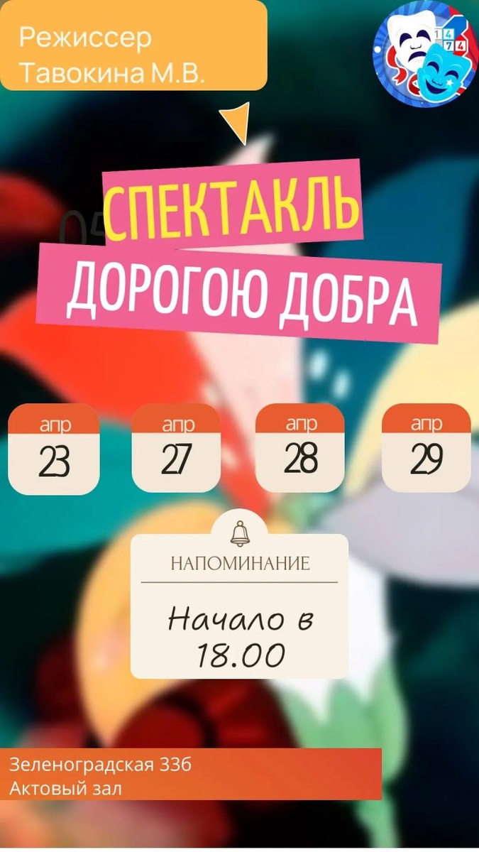 »! Младшая группа подразделения «Будем знакомы» школьного театра «Амплуа» приглашает на постановку по мотивам повести Валентина Катаева «Цветик‑семицветик»! Маленькие артисты подарят вам море эмоций и напомнят о самом главном — добре и дружбе. ❤️ 📍 Где: Зеленоградская, 33Б. 🎟 Вход бесплатный — оформите билет по ссылке, выбрав нужную дату: ✳️ 23 апреля, 18:00 ✳️ 27 апреля, 18:00 ✳️ 28 апреля, 18:00 ✳️ 29 апреля, 18:00 ✨ До встречи в зрительном зале! #ДОНМ #ДОНМ #ШколыКолледжиМосквы #Амплуа1474