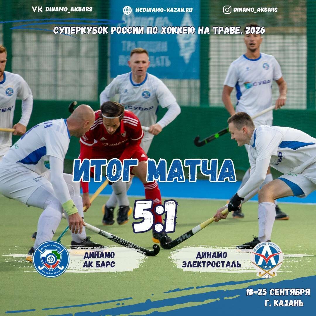 Автор: Евгений Романов Мужской клуб по хоккею на траве «Динамо-Ак Барс» завоевал Суперкубок России. В матче за трофей казанская команда обыграла «Динамо-Электросталь» со счетом 5:1. Голы: Голубев -3, Арусия-2 — Кураев Д.