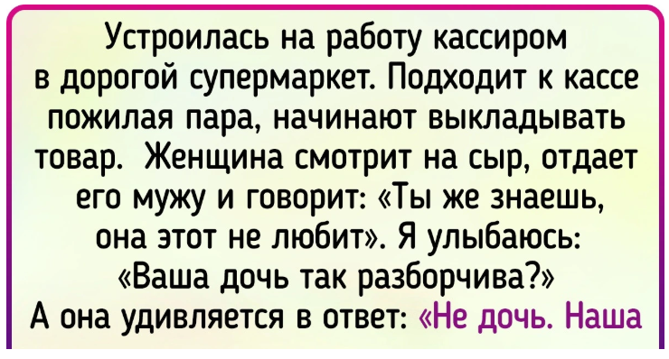 - Устроилась на работу кассиром в дорогой супермаркет. Подходит к кассе пожилая пара, начинают выкладывать товар. Женщина смотрит на сыр, отдает его мужу и говорит: «Ты же знаешь, она этот не любит». И просит принести другой. Я улыбаюсь: «Ваша дочь так разборчива?». А она удивляется в ответ: «Не дочь. Наша собака». © Sarah Lippman