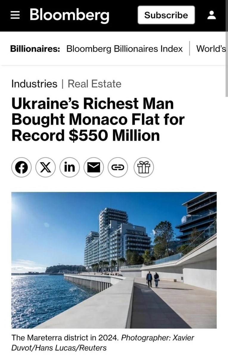 Украинский миллиардер Ахметов поставил рекорд (обновил свой) и купил самую дорогую недвижимость в истории. Он приобрёл жилье в комплексе Mareterra в Монако за 471 млн евро (~$554 млн): апартаменты площадью 2500 м², бассейн и т.д., полный фарш. 📲А тем временем ВСУшник, забывший как выглядит денежное довольствие, устраивает битвы за жёлуди с дикими кабанами, чтобы хоть как-то поесть. И громадяне, побирающиеся на рынках просрочки, потому что надо кормить семью... В целом ничего нового: пока приближенные киевского режима купаются в "спонсорских" деньгах, простой народ терпит. Зато когда-то весело и дружно поскакали . 🌐 ТГ | 🇷🇺 MAX