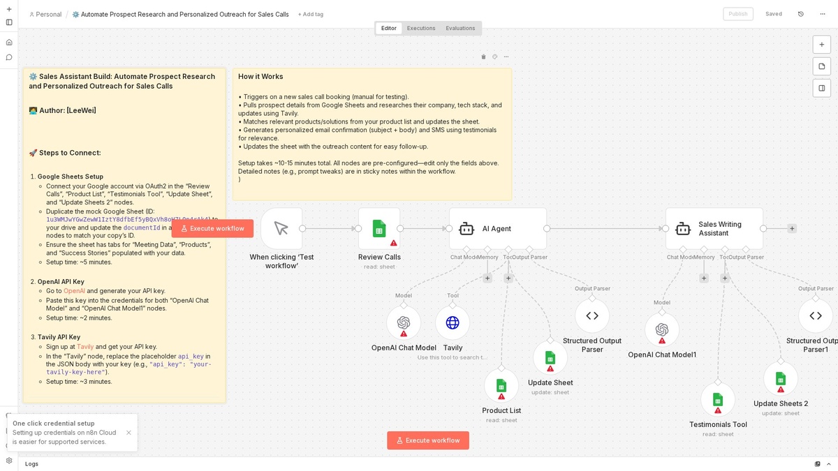 ⚡ Что делает: Автоматизация собирает данные о потенциальных клиентах из Google Sheets, анализирует их с помощью OpenAI и формирует персонализированные сообщения для продаж. Результаты отправляются обратно в таблицы для удобного доступа к информации. 👥 Кому подойдёт: Подходит для команд продаж, стремящихся повысить эффективность взаимодействия с клиентами. 💡 Пример: Собирает данные о клиентах, генерирует индивидуальные предложения и обновляет таблицу с результатами. 🔗 Ноды: manualTrigger, agent, lmChatOpenAi, toolHttpRequest, googleSheetsTool, outputParserStructured, googleSheets 📊 Сложность: Средний #n8n #automation #nocode #aiagent #ai #googlesheets ════════════════ 🎬 YouTube | ⚙️ Канал | 💬 Чат | 📮 Реклама