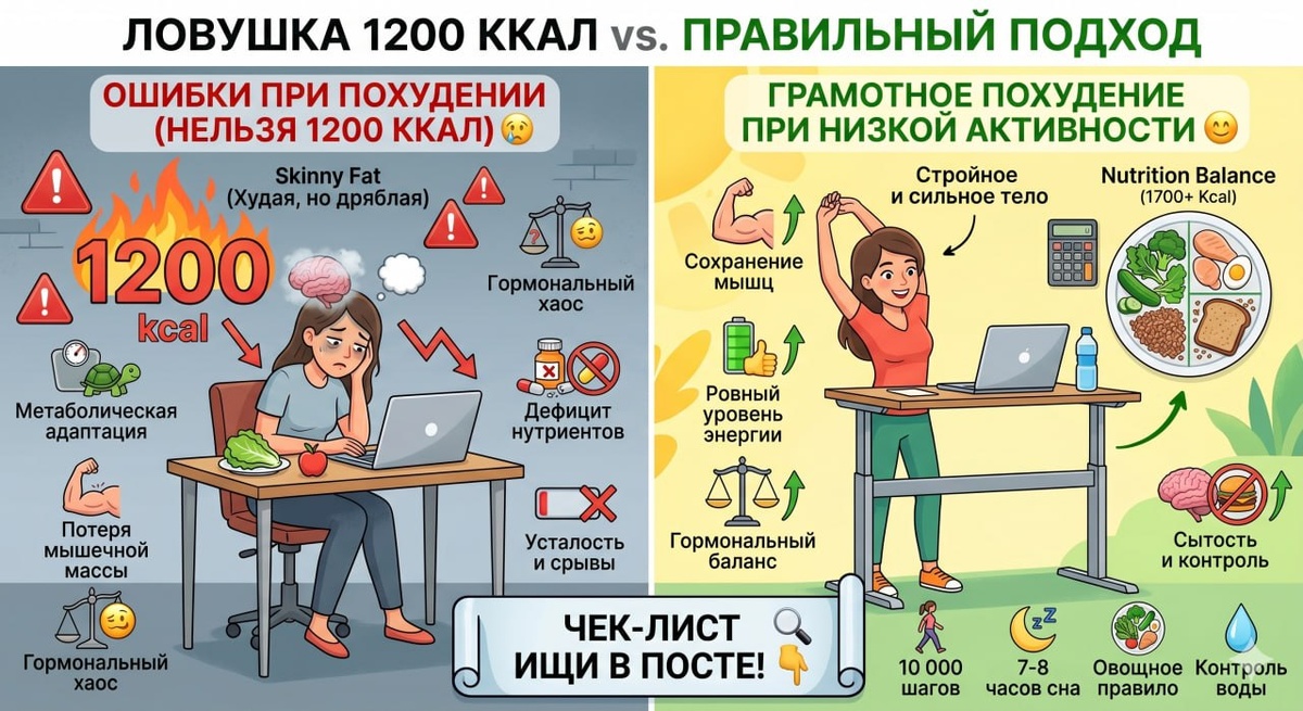 ? Привет! На связи твой проводник в мир осознанного питания. 🍎 Сегодня разберем одну из самых опасных ловушек в мире фитнеса и диетологии — магическую цифру «1200 ккал». Если ты годами пытаешься похудеть, срываешься, а вес возвращается с «друзьями», скорее всего, ты наступаешь на эти грабли. Разберемся, почему голодовка — это путь в никуда, и как начать худеть, если ты проводишь 8 часов за компьютером. 💻👇 Многие верят: «Чем меньше съем, тем быстрее похудею». Но наше тело — не печка, а сложнейшая биохимическая лаборатория. Метаболическая адаптация (Эффект «плато»): При резком дефиците организм переходит в режим энергосбережения. Он снижает выработку гормонов щитовидной железы и замедляет обмен веществ. Исследование: https://pubmed.ncbi.nlm.nih.gov/24500611/ Потеря мышечной массы: Для тела мышцы — «дорогое» удовольствие в плане обслуживания. На 1200 ккал организм в первую очередь будет жечь мышцы, а не жир, чтобы выжить. Итог — «skinny fat» (дряблое тело при низком весе). Исслед