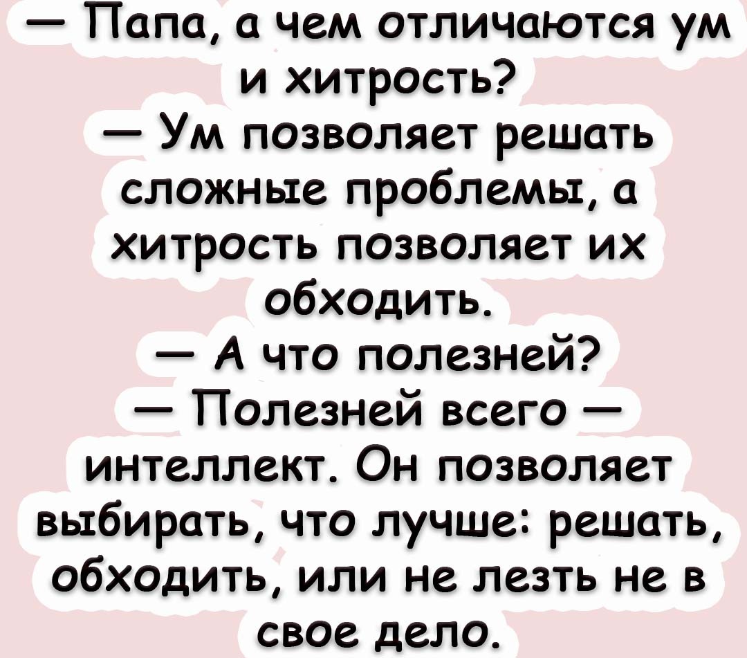 Папа гениально разложил по полочкам. Ум - это как молоток, им можно забить гвоздь. Хитрость - это как плоскогубцы, ими можно вытащить гвоздь или что-то другое подцепить. А интеллект - это как мастер, который знает, когда нужен молоток, когда плоскогубцы, а когда вообще лучше взять отвертку и просто не трогать этот ящик. Вот это я понимаю, родительская мудрость в действии!