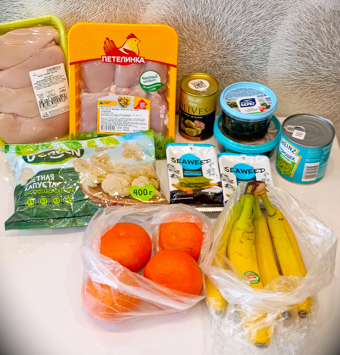 Взяла бананы и мандарины — отличные фрукты для витаминов, баночку зелёного горошка для салатов, куриное филе и филе бедра — мясо всегда пригодится для разных блюд. Также купила салат из морской капусты, баночку зелёных оливок и коктейль из морепродуктов — всё это разнообразит рацион. Из заморозки