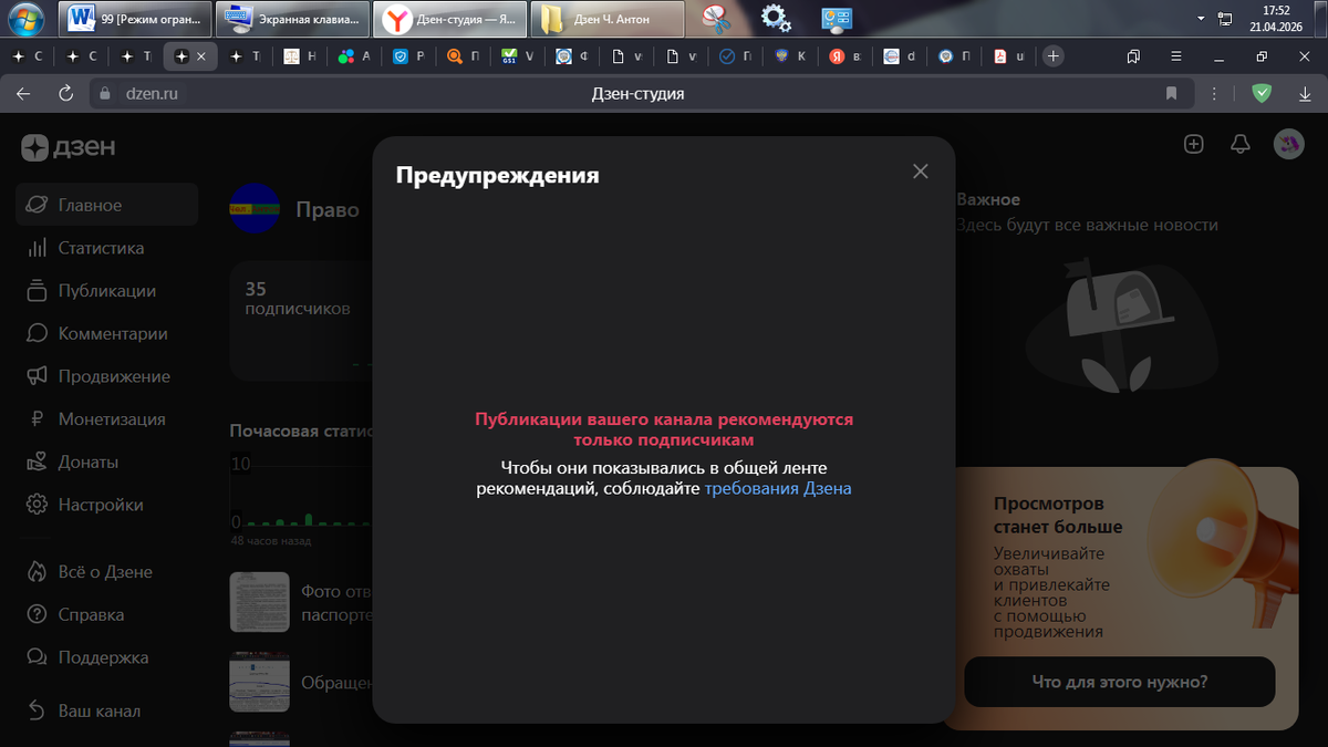 Есть сайт на территории Российской Федерации «Дзен – главная новостная информационная платформа…» по адресу: https://dzen.ru/ иностранного коммерческого юрлица VK LLC (ООО "ВК") ИНН: 7743001840, под торговым знаком дзен. Был создан мою канал «Право» по адресу: https://dzen.ru/chelovekanton Далее в Дзен-студия по адресу: https://dzen.ru/profile/editor/chelovekanton есть мне Предупреждения Публикации вашего канала рекомендуются только подписчикам Чтобы они показывались в общей ленте рекомендаций, соблюдайте требования Дзена. Фотографию от 21.04.2026 г. предупреждения прилагаю следующую. Еще далее перехожу в «Требования к контенту» по адресу: https://dzen.ru/help/ru/requirements/rules.html Согласно настоящих «Требования к контенту» публикации, которые могут быть показаны только подписчикам или полностью заблокированы - В Дзене запрещены материалы, которые прямо или косвенно побуждают пользователей к участию в азартных играх, лотереях и стимулирующих мероприятиях или пытаются вызвать у