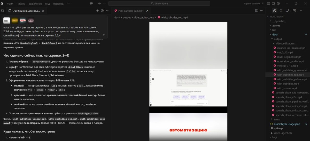 👇 я записываю ролик за пару минут, а потом трачу 30 минут на монтаж вырезать «эээ», убрать длинные паузы, наложить субтитры, придумать заголовки, описание, а потом публикация по очереди во все соцсети Это время, которое я могла бы потратить на реализацию новых идей или отдыхать Поэтому прямо сейчас я доделываю систему, которая делает за меня монтаж роликов без моего участия Смотрите, какую цепочку я собираю 👇 → Закидываю исходник на Яндекс.Диск - просто сырое видео с телефона или длинное видео, как я работаю → AI агент забирает файл, анализирует каждое слово и сам вырезает все паузы, вздохи и слова-паразиты → AI агент анализирует смысл, пишет сценарий, накладывает динамичные субтитры (по одному слову в центре), накладывает речь, если нужно, и даже сама зумирует важные части экрана, чтобы картинка не была скучной → AI агент пишет заголовки под каждую соцсеть и сам рассылает ролик в YouTube, VK, Instagram* и Pinterest Все управление через одну кнопку в мессенджере На каком