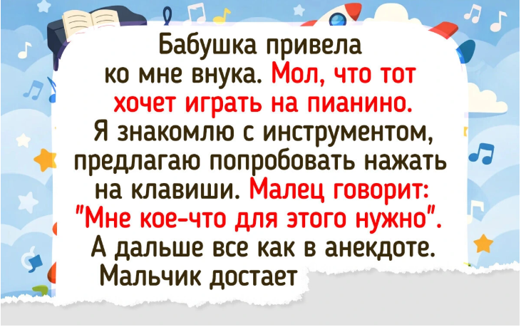 - Бабушка привела ко мне внука. Мол, что тот хочет играть на пианино. Я знакомлю с инструментом, предлагаю попробовать нажать на клавиши. Малец говорит: «Мне кое-что для этого нужно». А дальше все как в анекдоте. Мальчик достает из кармана машинки и начинает играть в них на фортепиано. Вот так буквально он понял предложение бабушки поиграть на фортепиано. @ ADME