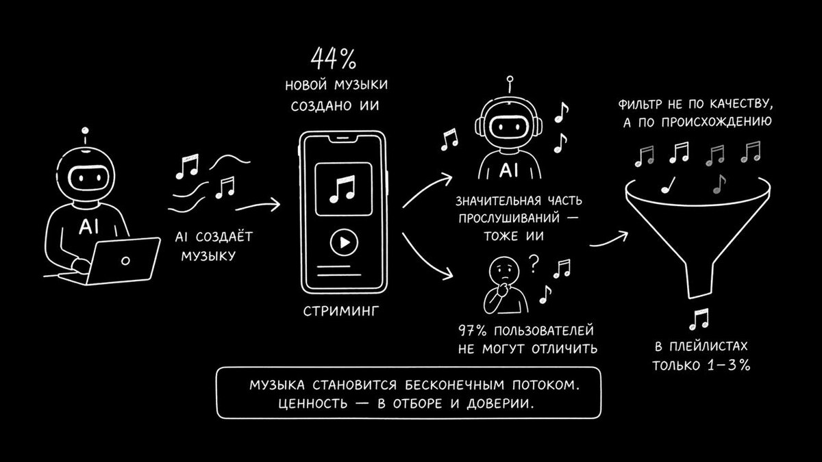 Музыка перестала быть «человеческой». Deezer заявляет, что уже 44% всей новой музыки создаётся с помощью ИИ — это не эксперимент, а новая норма. Стриминг полностью поменял правила игры: люди не выбирают музыку сами, они слушают то, что дают алгоритмы. ИИ этим пользуется — генерирует тысячи треков быстро и дешево, заливая платформы контентом. Дальше начинается странное: значительная часть прослушиваний такой музыки — это тоже ИИ, а не люди. Получается замкнутый цикл: ИИ делает музыку, ИИ её слушает, алгоритмы думают, что это популярно. При этом 97% пользователей не могут отличить ИИ-треки от человеческих. Но есть нюанс: несмотря на 44% загрузок, реальное прослушивание ИИ-музыки всего 1–3%, потому что платформы специально не пускают её в рекомендации. И вот главный сдвиг — фильтруют уже не качество, а происхождение. Не «нравится ли это», а «человек ли это сделал». Музыка превращается в бесконечный поток, где ценность не в создании, а в отборе. И главный вопрос теперь не в том, заменит