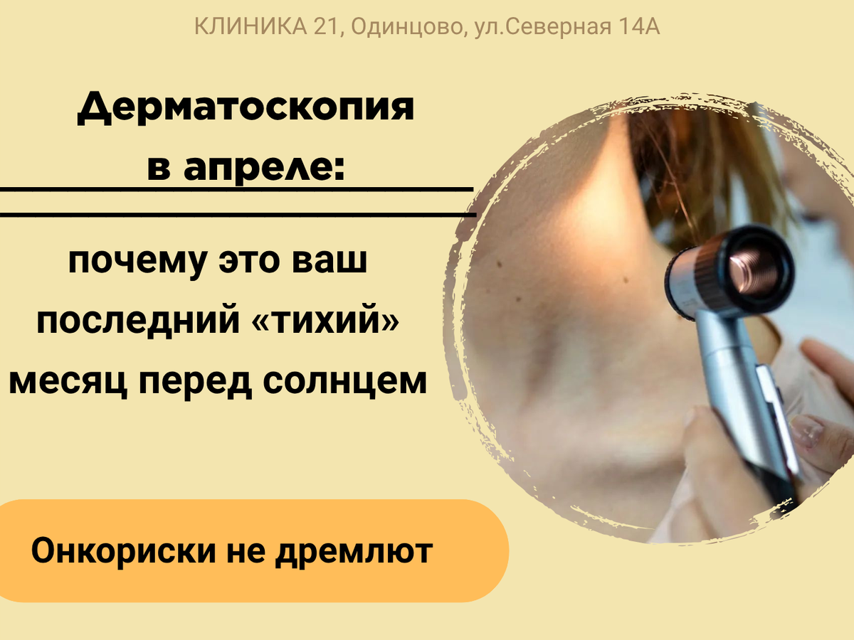 🌿Апрель обманчив. Солнце уже яркое, но ещё не жжёт. Именно сейчас — идеальный момент, чтобы проверить родинки, не дожидаясь очередей в онкоцентрах и аврала перед отпуском. Рассказываем, почему май будет поздно. 🌤 Миф: «Летом тоже можно провериться» Реальность: С мая по август поток пациентов у дерматологов растёт в 3-4 раза. Все вдруг вспоминают о родинках, когда получают солнечный ожог или замечают изменение. Запись к платному специалисту — за 2 недели, к бесплатному — месяц и более. ⚠️ Апрель — последний месяц спокойствия ✔️1. Нет загара. Дерматоскоп (аппарат для исследования кожи) лучше всего «видит» структуру родинки на чистой, незагорелой коже. Загар снижает контрастность и маскирует изменения. ✔️2. Нет очередей. Вы проходите осмотр за 15–20 минут без нервотрёпки. ✔️3. Есть время на действия. Если дерматолог увидит подозрительное образование и назначит удаление, вам нужно будет 2 недели беречь ранку от солнца. В апреле это легко. В мае — уже проблема. ⚡ Онкориски не дремлют Мела