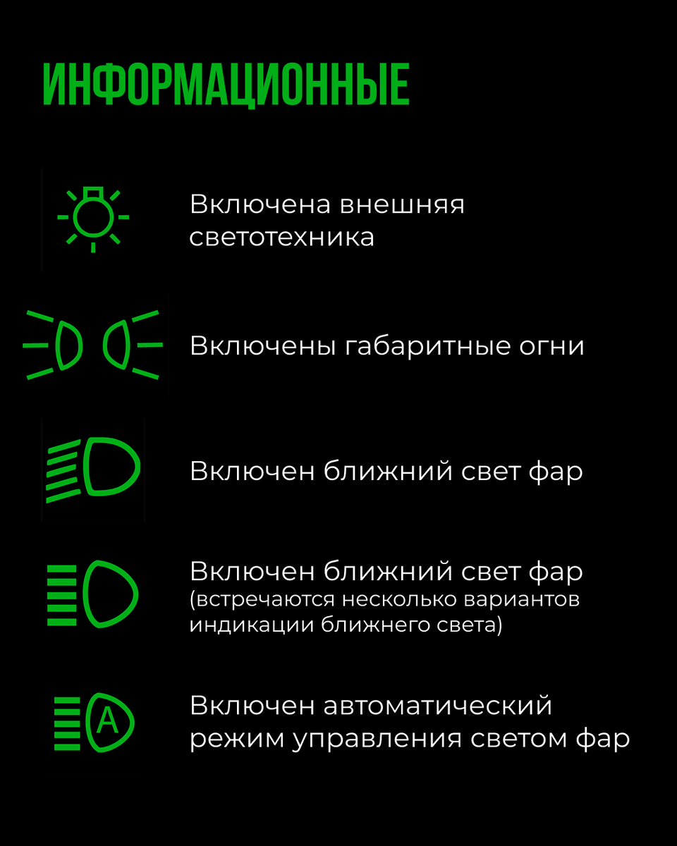 Сообщают о текущем состоянии автомобиля. Например, включён свет или активирован режим. Предупреждающие
