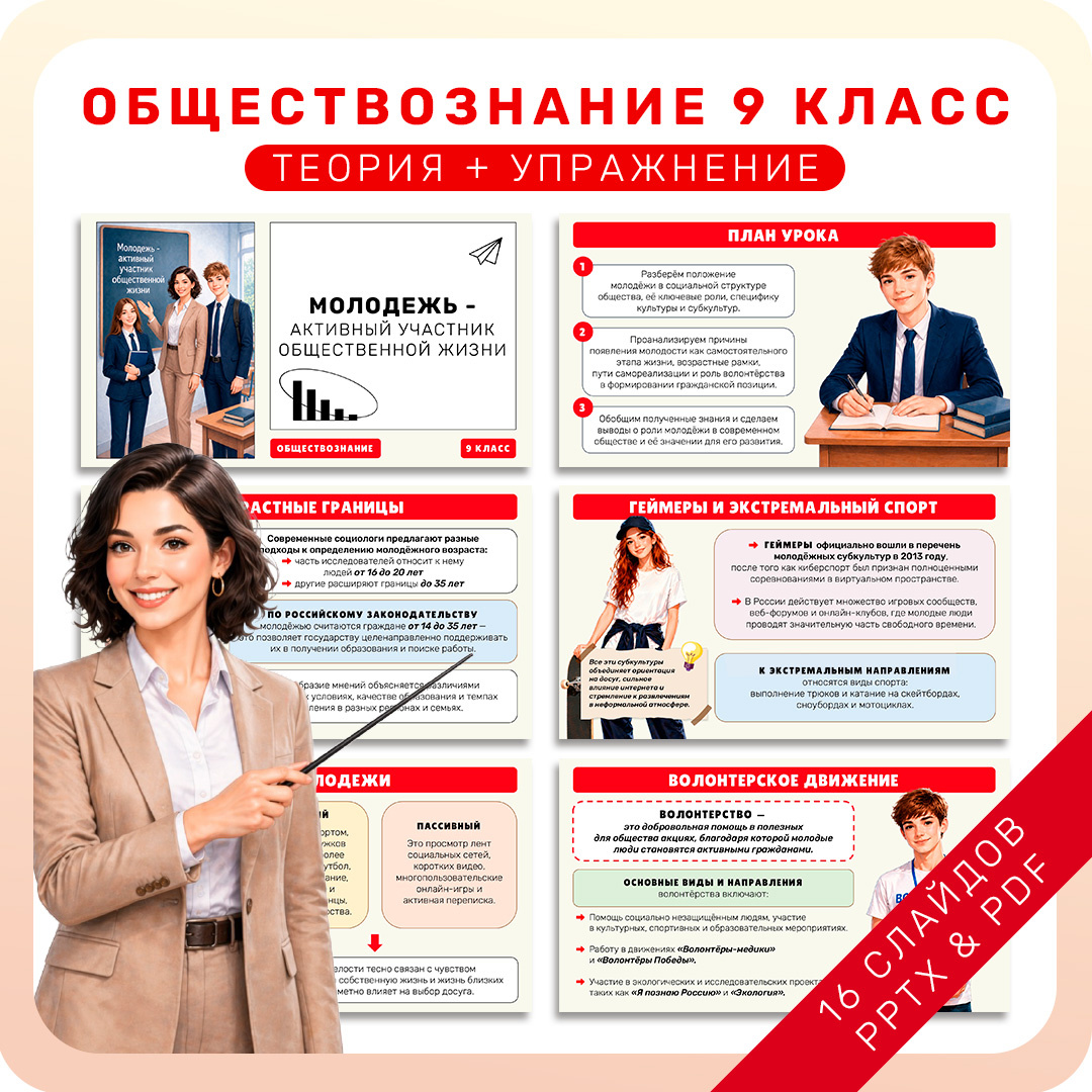 Презентация посвящена изучению положения молодёжи в современном обществе, её роли как особой социальной группы и активного участника общественных процессов, а также формированию представлений о молодёжной культуре, субкультурах и волонтёрской деятельности в рамках курса обществознания 9 класса. Слайды презентации: Материал выстроен последовательно — от анализа положения молодёжи в обществе и её особенностей к изучению культуры, субкультур, возможностей самореализации и социальной активности, включая волонтёрство. Файл представлен в редактируемом формате PPTX, что позволяет адаптировать содержание под уровень класса и особенности урока, а также в формате PDF для удобного просмотра и печати. Разработка может использоваться на уроках изучения нового материала, при подготовке к итоговым работам, а также в контексте последующей подготовки к ОГЭ и ЕГЭ по обществознанию. Структура слайдов обеспечивает логичную подачу материала и удобство демонстрации на уроке.