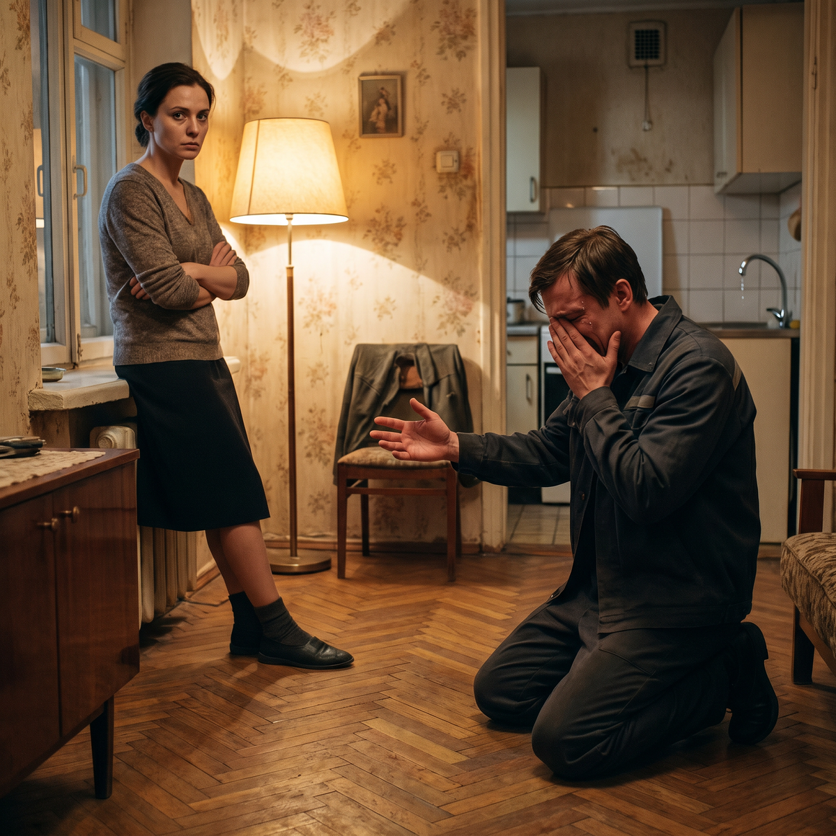 Он не сел. Просто опустился на колени — прямо на скрипучий паркет, неловко, тяжело, как будто ноги сами подогнулись.