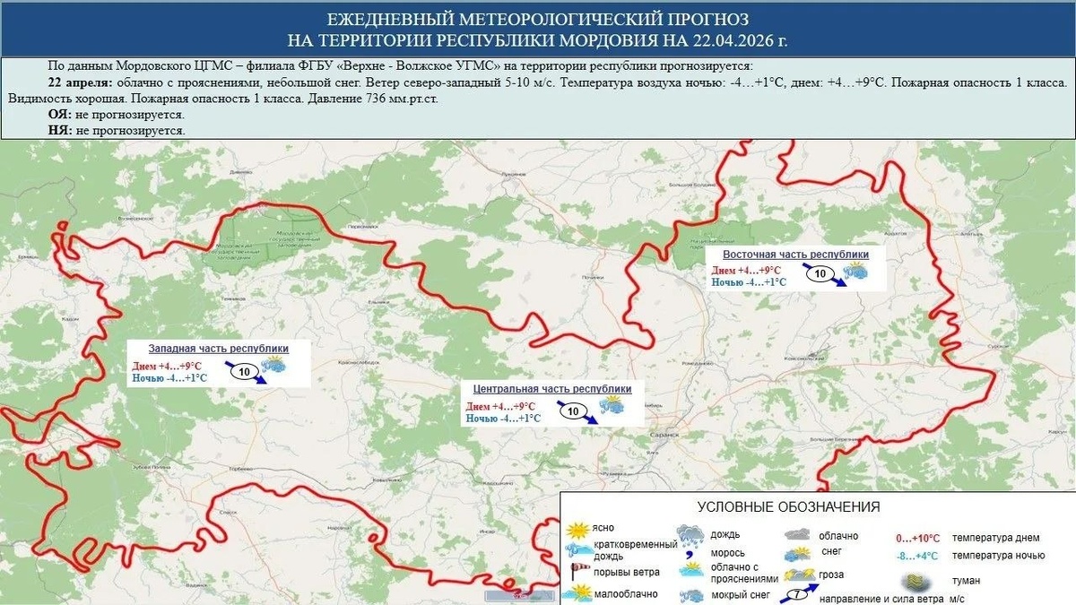 ☁️⛅⛈️ 22 апреля в Мордовии облачно с прояснениями, небольшой снег