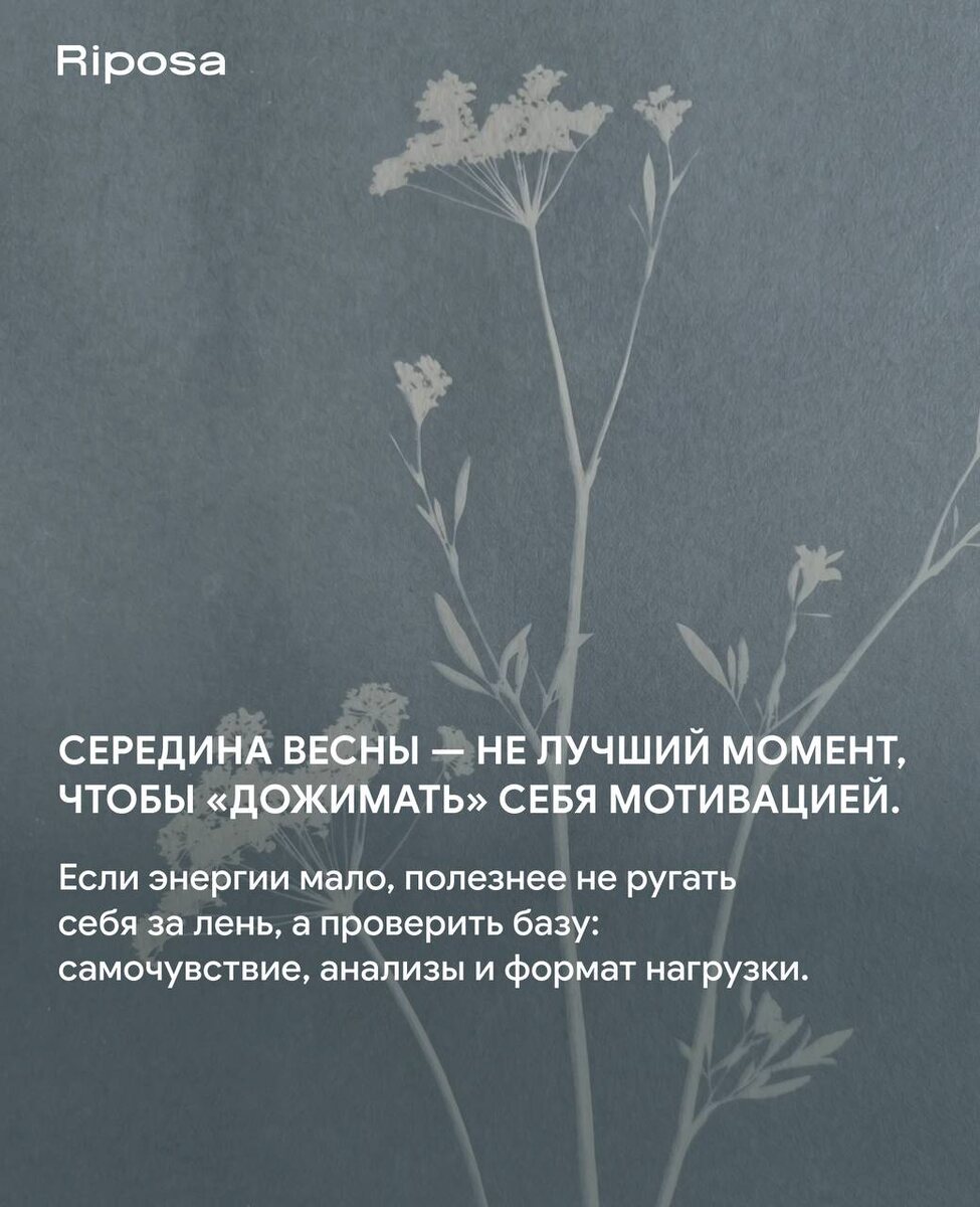 Вместо идеи «собраться» попробуйте идею «поддержать себя»🙏🏻 Помощь организму выглядит очень просто: раньше лечь спать, прогуляться на свежем воздухе, убрать лишний шум, сделать вечер медленнее, вернуть телу ощущение комфорта. Весна не требует от нас идеальности. Она скорее напоминает: восстановление — это тоже движение вперёд🙌🏻 • Сайт Riposa • Мы на маркетплейсах