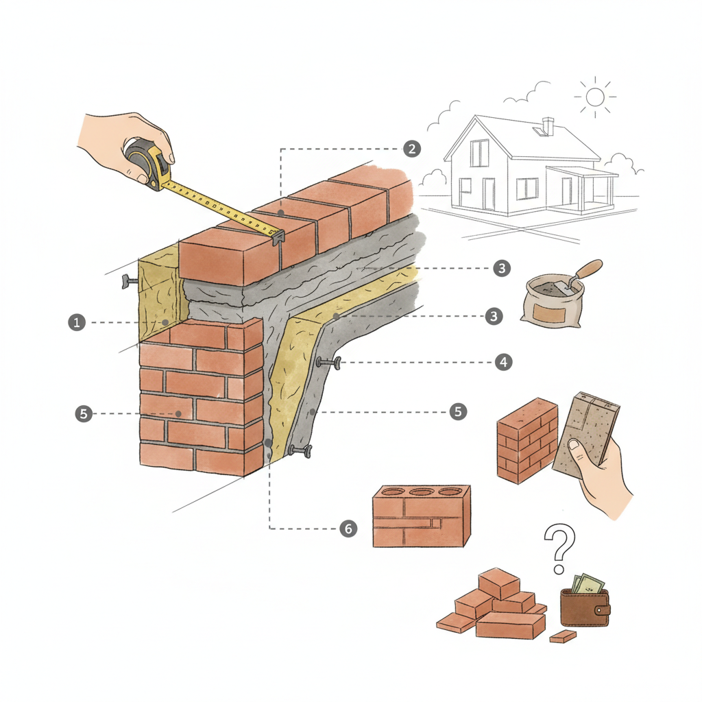 Чтобы кладка была единым целым с домом, нужна перевязка. На углы, откосы и оконные проёмы уходит значительно больше материала - иногда до 30% сверх площади стен. Если вы решили кирпич облицовочный купить без запаса, то через месяц строители встанут и скажут: «Всё, кончился». А нужной партии на складе уже не будет. Оттенок новой партии неизбежно будет отличаться, и фасад пойдёт «пятнами». Берите всегда плюс 10-15% к объёму, особенно если используете редкие цвета.