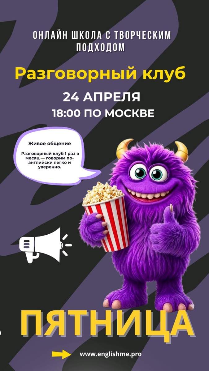 ! ☀️ Под конец учебного года дети часто чувствуют усталость. Чтобы поддержать их и разнообразить учебный процесс, мы приглашаем ваших детей в наш очередной разговорный клуб 24 апреля в 18:00 по Москве. В этот раз мы подготовили особенную, расслабляющую программу: будем смотреть полезные и интересные видео на английском языке. Это отличная возможность потренировать понимание на слух в легкой форме и пополнить словарный запас новой актуальной лексикой. Ждем всех в Зум. Ссылка на подключение будет направлена заранее.