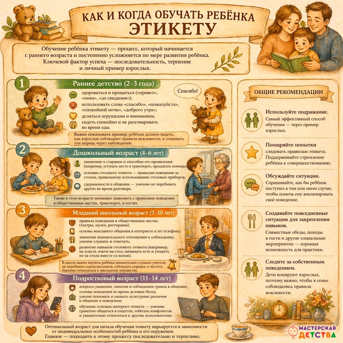 В курсе «Растим ребёнка» у нас есть отдельный блок, посвящённый этикету — мы подробно разбираем, какие навыки формируются в разном возрасте и как их поддерживать в повседневной жизни. Потому что важно не просто учить правилам, а соотносить их с возможностями ребёнка. Собрали удобную инфографику: что и в каком возрасте действительно можно ожидать и развивать. Смотрите 🟢 #МастерскаяДетства