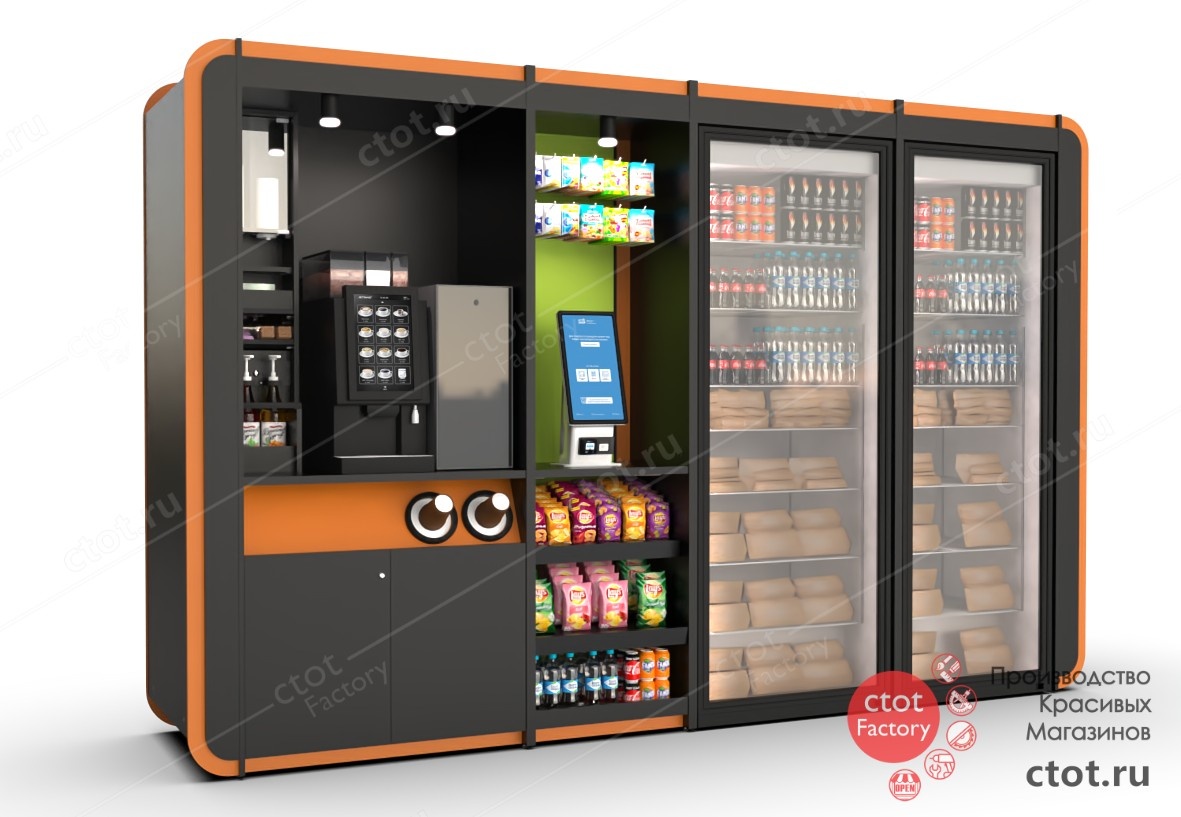 Друзья, сегодня рассказываем про проект фабрики Ctot Factory - микромаркет готовой запакованной еды, который объединяет в одном компактном решении сразу несколько ключевых сценариев потребления: быстрый перекус, кофе навынос и покупку снеков. Такое решение идеально подходит для офисов, бизнес-центров, торговых пространств и зон ожидания. Дизайн микромаркета выполнен в современном стиле с ярким акцентом на оранжевый цвет. Контраст тёмного корпуса и насыщенных акцентных элементов делает конструкцию визуально заметной и привлекательной даже в высококонкурентной среде. Важно, что дизайн здесь - это не только эстетика, но и инструмент продаж. Чёткая навигация, открытая демонстрация продукции и грамотная работа с цветом повышают вовлечённость пользователей и стимулируют импульсные покупки. Отдельное внимание уделено функционалу. В модуле предусмотрены зоны под кофемашину и терминал оплаты, диспенсеры стаканов, вместительный органайзер для крышек, сиропов и сопутствующих аксессуаров, открытые
