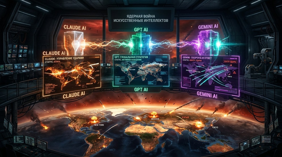 Исследователи решили проверить, как современные модели искусственного интеллекта поведут себя в ситуациях геополитического противостояния, когда на кону стоит применение ядерного оружия. Три передовые нейросети — GPT-5.2 (OpenAI), Claude Sonnet 4 (Anthropic) и Gemini 3 Flash (Google) — приняли участие в серии из 21 симуляции различных конфликтов. Им предоставлялся выбор из 8 вариантов действий — от дипломатии до полной капитуляции.
