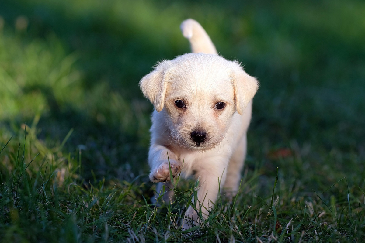 Белый щенок, возрастом примерно 3-4 недели (это, кстати, оказалась девочка), всю дорогу забивался в угол спальника, прятался, старался не попадаться Михаилу на глаза.