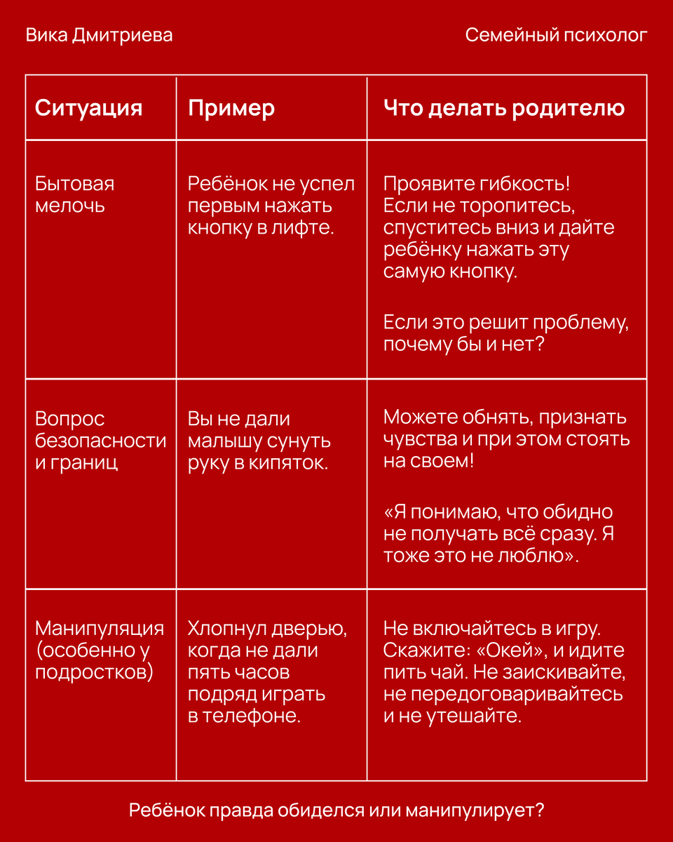 Каждый родитель знаком с этим моментом: «неправильный» цвет кружки, запрет на лишний час в телефоне или вперед ребёнка нажатая кнопка лифта, и вот уже перед вами надутые губы, слезы, а то и хлопающая дверь. Привет, дорогие мои! В новой статье разбираю, как избежать последнего. Нет одного правильного ответа, как реагировать на детские обиды, который работает всегда и в любых случаях. Одинаковая реакция в любой ситуации — это в принципе признак некоторой ограниченности. Для нормального общения нам нужно считывать оттенки ситуации. Вот вам пример: Если ребенку что-то обидно во взаимодействии с вами, ничего страшного, так бывает, это жизнь. Но некоторым мамам и папам бывает невыносимо находиться в конфликте. Чтобы прекратить ссору, они сдаются: «Ладно, возьми планшет, только не обижайся». И вот ребенок учится достигать целей через демонстративное страдание. Так формируется взрослый, который не умеет разговаривать. Вместо этого он хлопает дверью и бросает трубку в ожидании, что перед ним пр