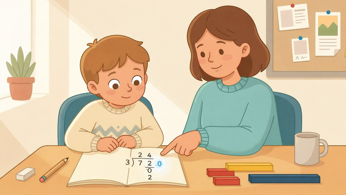Если деление столбиком даётся ребёнку мучительно, шаг назад даст больше, чем шаг вперёд. Проверьте таблицу умножения и разряды. Если там всё чисто, значит, дело в самой процедуре, и помогут проговорка и разбор одного примера по шагам.
