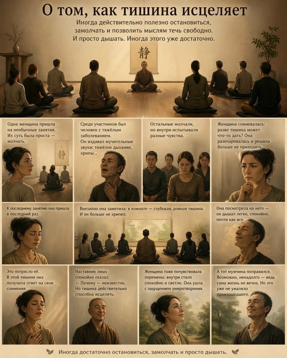 Эту историю передали из уст в уста. Одна женщина из далёкой страны однажды пришла на необычные занятия. Их суть была предельно простой — людей учили молчать. Никаких медитаций, упражнений или особых техник. Просто сидеть и хранить тишину. Даже наставник не произносил ни слова. Среди участников оказался человек с тяжёлым заболеванием — опухолью в носоглотке. Его состояние было крайне серьёзным. Вероятно, он хватался за любую возможность облегчить страдания и продлить жизнь. Он тоже пришёл и молча сидел вместе со всеми. Но время от времени издавал мучительные, тревожные звуки — тяжёлое дыхание, хрипы, которые невозможно было не заметить. Остальные участники сохраняли молчание, но внутри испытывали самые разные чувства — от раздражения до сочувствия. Та самая женщина тоже не была исключением. Она сомневалась: разве в этом есть смысл? Неужели тишина сама по себе может что-то дать? Казалось, всё это — пустая трата времени. Прошла неделя — напряжённая и непростая. К последнему занятию она ок