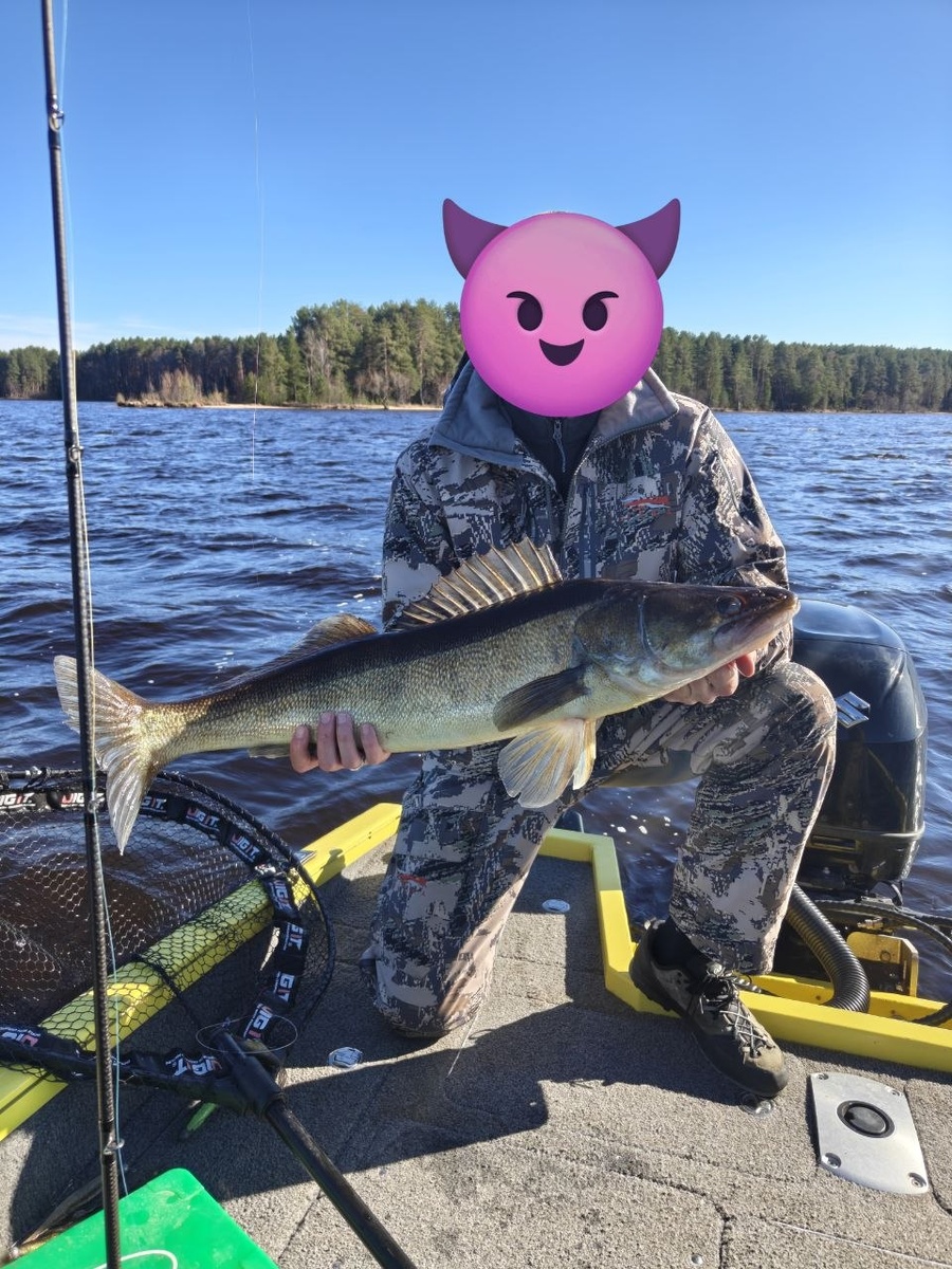 . Вода 5.5 градусов всего . На мой взгляд для дневной весенней рыбалки по окуню маловато . Окунь вялый , крайне лениво ходит за приманками , резких стартов и поклевок нет вообще . Все происходит словно вода - кисель и ему надо прилагать неимоверные усилия , чтобы двинуться хотя бы на полметра ... Процессами , характерными для скорого нереста окуня , даже и не пахнет . Рыба ведёт себя так , словно лёд сошел только вчера . Некоторые ямы вообще ещё забиты белью , которая ещё не разбрелась по местам помельче с водой потеплее Вобщем , сложно , долго , муторно , без драйва ... Но рыбки немного побрали и вот такого окушка таки уговорили . К слову сказать , сегодня на виброхвосты отклика - 0 , даже ни единого выхода не было. Все на слаг 🤷♂
