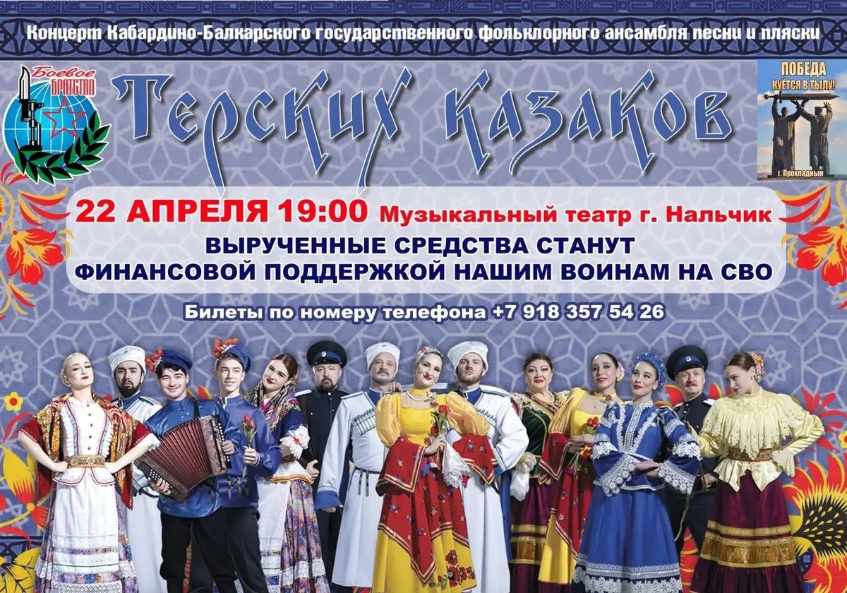 ❗️❗️❗️❗️❗️❗️ Уважаемые жители и гости республики! 🤩22 апреля в Государственном музыкальном театре КБР состоится благотворительный концерт Государственного ансамбля песни и пляски «Терских казаков» «Встань за веру, Русская земля!». 🤩 В программе концерта прозвучяат популярные песни военных лет, народные, казачьи, современные авторские произведения, отражающие дух великой России, победного наследия и искреннего патриотизма! Специальные гости акции Ирина Даурова и Ирина Ракитина. 🤩Все вырученные средства будут переданы волонтерской группе «Победа куется в тылу» Всероссийской общественной организации ветеранов «Боевое братство» г. Прохладный на приобретение и доставку гуманитарной помощи нашим защитникам в зону СВО. 🤩Мы благодарим всех, кто не останется в стороне и станет частью нашего общего дела! ВООВ «БОЕВОЕ БРАТСТВО» 8-918-35-75-426. 🤩 Начало: 19:00.