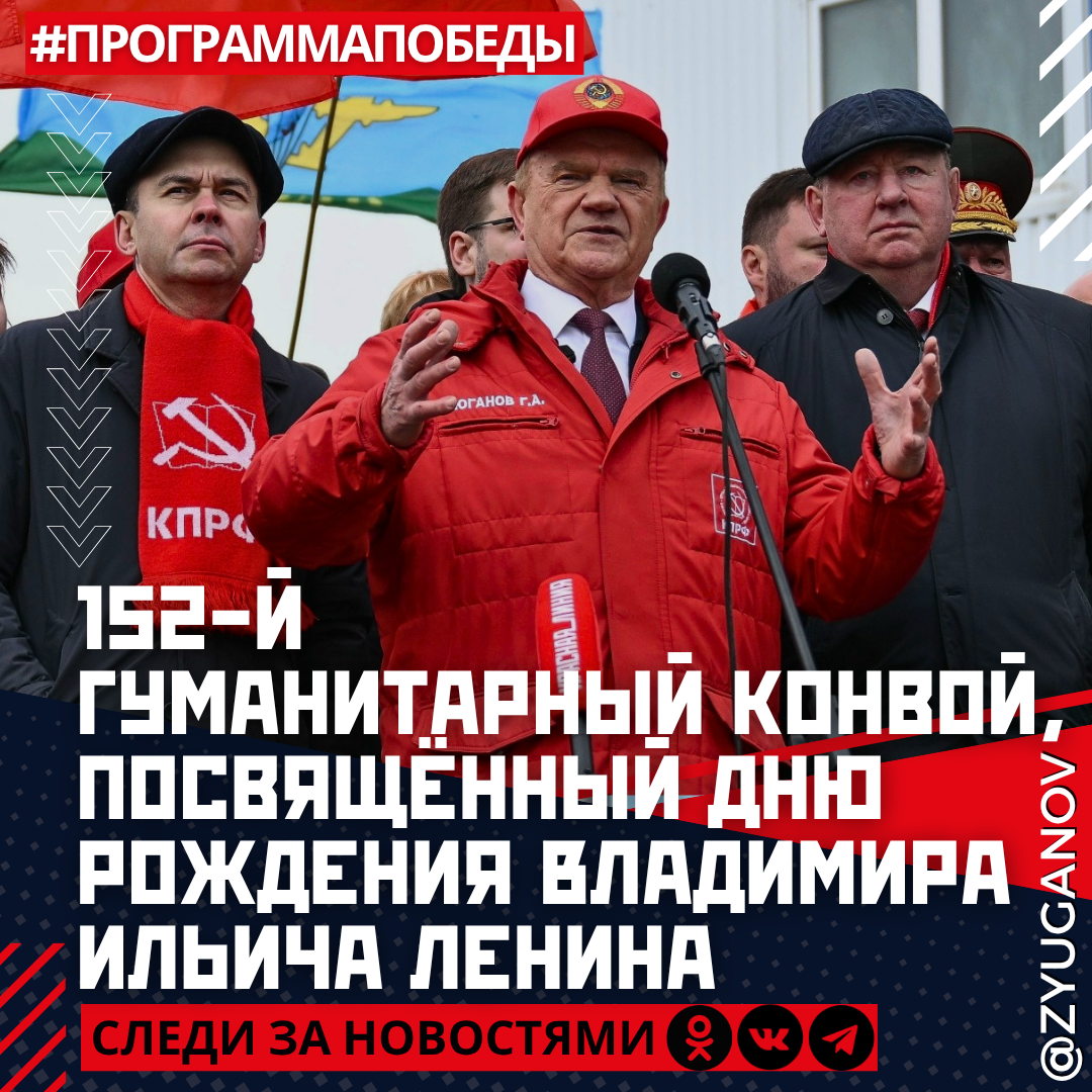 Друзья! Накануне мы отправили на Донбасс и в прифронтовые районы 152-й гуманитарный конвой, посвящённый дню рождения Владимира Ильича Ленина. Ленин не только спас российскую и русскую государственность. Он предложил стране новую эпоху, в которой главной ценностью стал человек труда, а решения принимались в интересах большинства. Именно этот подход позволил собрать страну, провести индустриализацию, создать мощные образование и науку, воспитать поколение победителей и поднять над Рейхстагом Знамя Победы. Сегодня этот исторический опыт особенно важен: стране нужны принципиальные решения, мобилизация ресурсов, поддержка производства, села, науки и армии. Именно поэтому КПРФ предлагает Программу Победы. В формировании конвоя участвовали партийные организации, Штаб протестных действий, депутаты, комсомольцы и наши сторонники по всей стране. Шестнадцать 20-тонников отправились на фронт, в приграничные регионы со всем необходимым для бойцов. Низкий поклон нашим солдатам, командирам и добровол